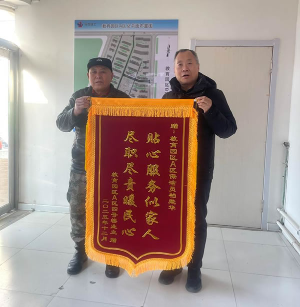 近日,三和物业A区业主接待服务中心传来暖心喜讯,公司保洁柏荣华凭借日复一日的贴心服务与尽职尽责的工作态度,赢得了所服务楼栋业主的高度认可与诚挚感谢,四号楼业主特意将一面印着“贴心服务似家人 尽职尽责暖民心”的锦旗送到柏荣华手中,以此表达对他工作的肯定与赞许,也为整个物业服务团队注入了满满的温暖与动力。